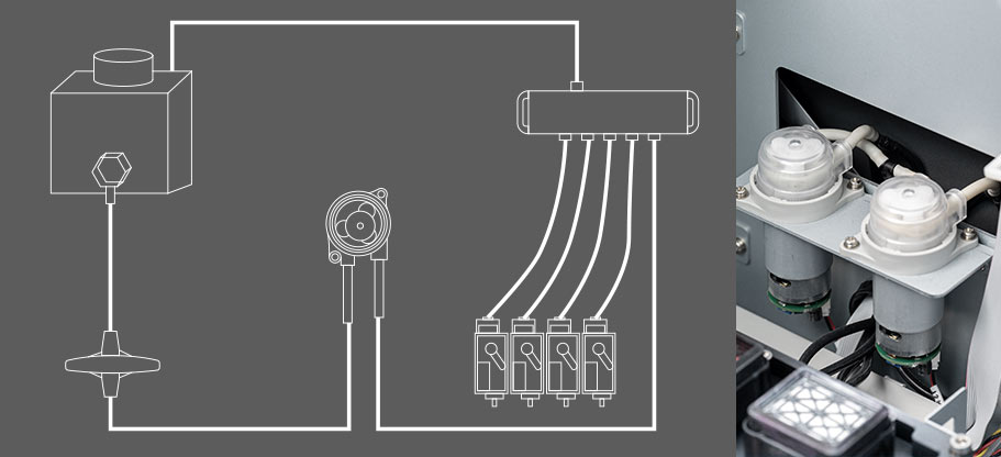 La bomba peristáltica integrada con presión moderada y buen sellado de gas protege el cabezal de impresión. La circulación continua de tinta blanca previene eficazmente la sedimentación y reduce la probabilidad de obstrucción del cabezal de impresión.
